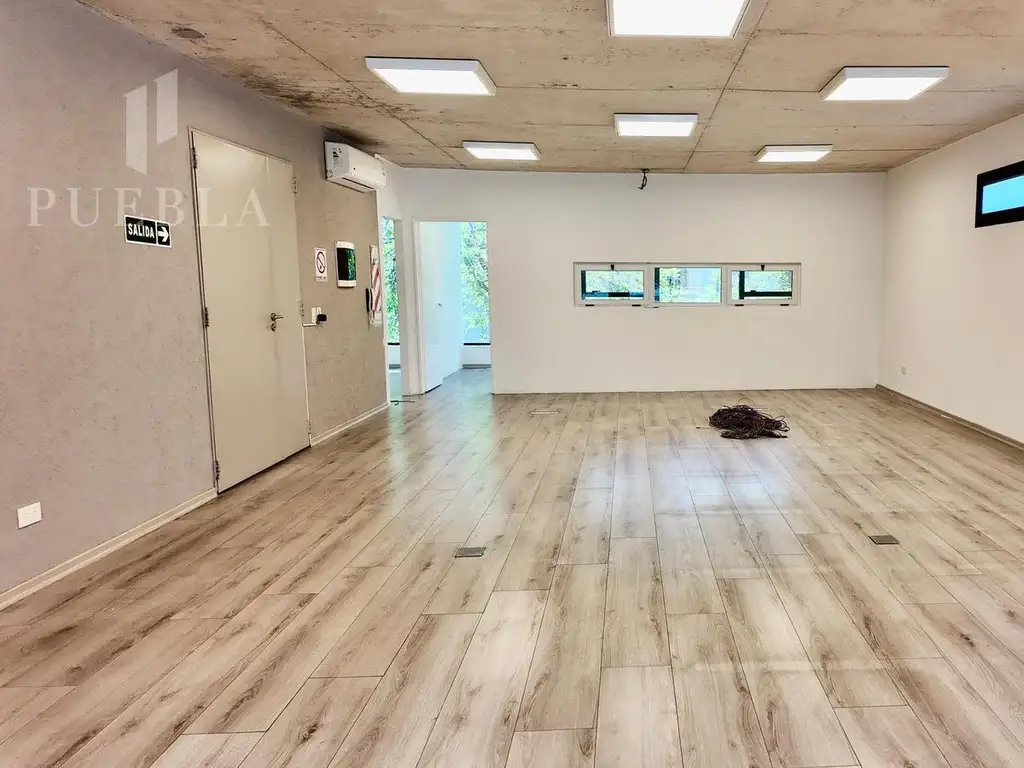 Cuenta con una oficina privada y una sala de reuniones, dos baños, kitchenette, aires acondicionados instalados, piso flotante y artefactos de iluminación colocados.