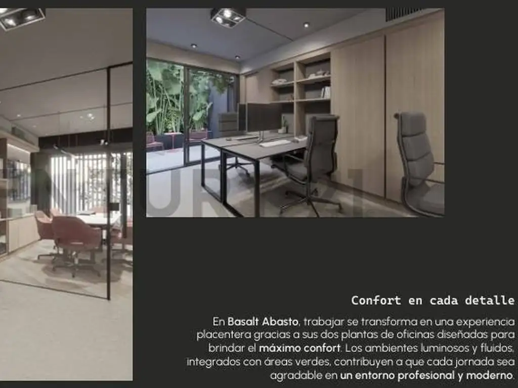Confort en cada detalle En Basalt Abasto, trabajar se transforma en una experiencia placentera gracias a sus dos plantas de oficinas diseñadas para brindar el máximo confort. Los ambientes luminosos y fluidos, integrados con áreas verdes, contribuyen a que cada jornada sea agradable en un entorno profesional y moderno.
