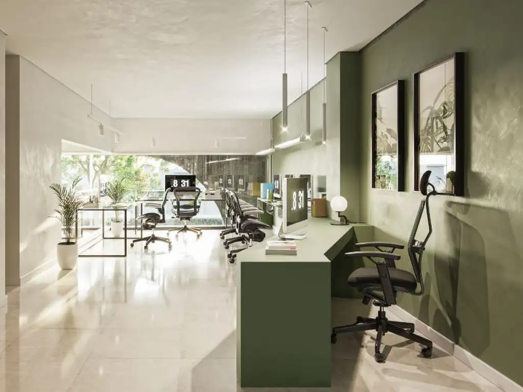 Ingresando a la misma nos encontramos con un recibidor, luego tenemos dos espacios amplios de oficina, uno de ellos privado, una cocina, dos baños, y sala de reuniones con salida al balcón.