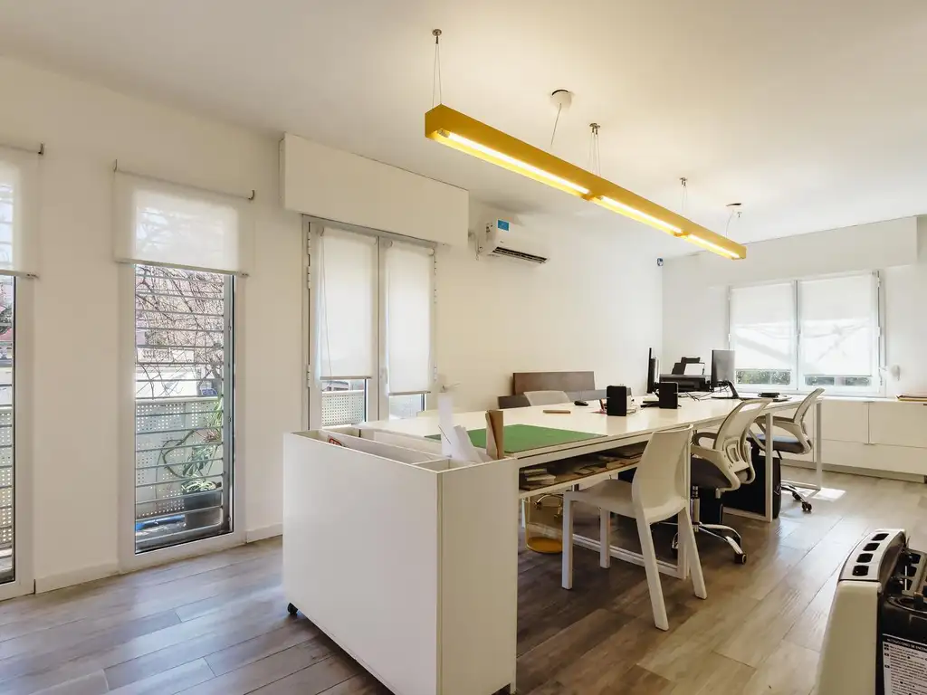Primer piso: recibidor/sala de espera, espacio de trabajo para 10/12 puestos de trabajo con salida al balcón, espacio privado/sala de reuniones para 2 a 4 puestos de trabajo con salida a balcón, kitchenette, toilette