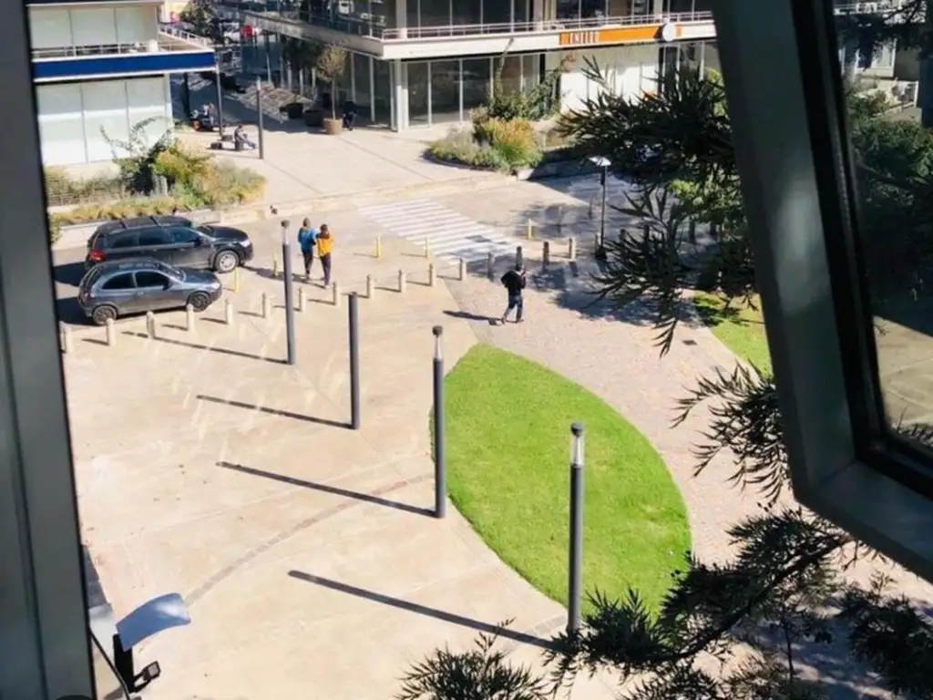 Zona verde en común con bancos para sentarse, Banco Comafi, locales comerciales y cafeterías.