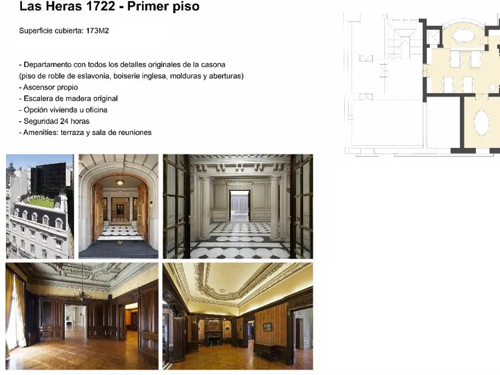 Se accede por la antigua casona a través de la escalera original de madera o por ascensor privado. Mantiene su arquitectura y excelentes materiales (pisos, boisserie. molduras, aberturas, etc) y se han restaurado los sectores de baños y cocina.