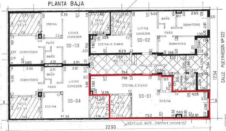 Compuesta de hall de recepción (4,49 m x 3,01 m), dos privados (2,17 m x 4,90 m / 3,96 m x 3,01 m), baño y patio (2,24 m x 2,53 m).