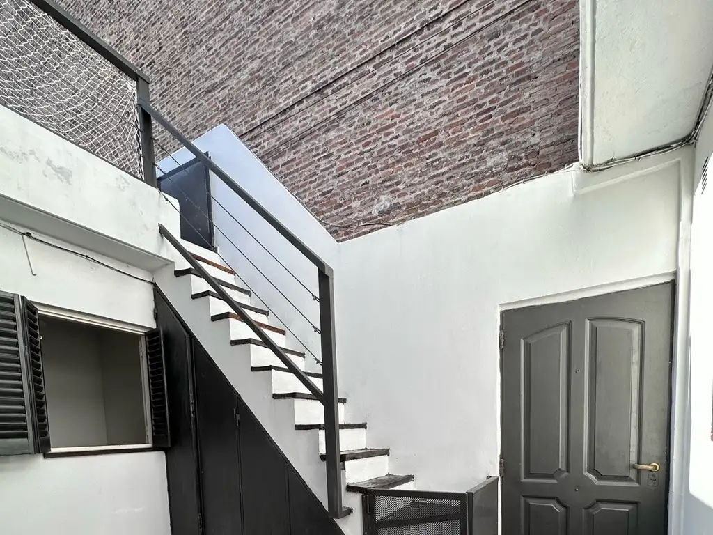 Y la escalera que va a la planta alta, con terraza exclusiva, parrillero semi cubierto, una habitación independiente con piso de cemento alisado, vestidor y baño en suite, completo con bañera y mampara, sanitarios de loza blanca.