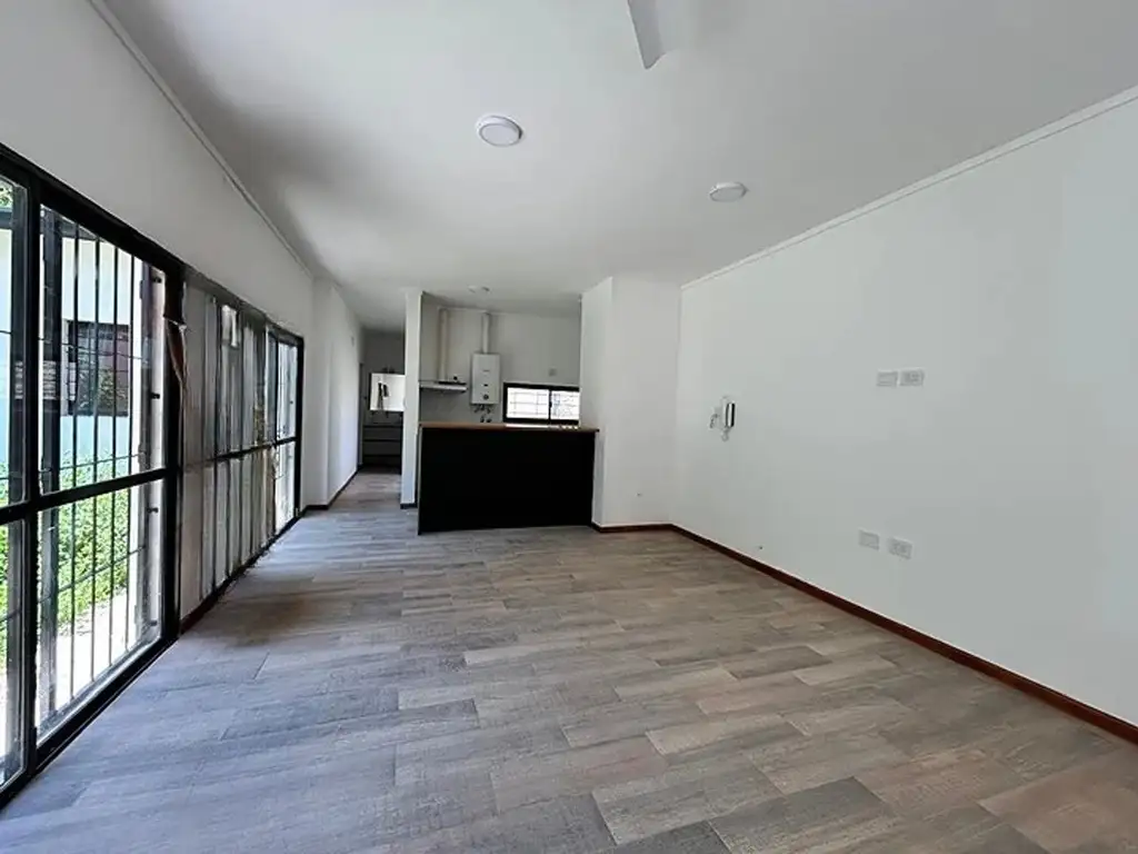 El departamento se encuentra emplaza en su totalidad en planta baja. Cuenta con una amplia cocina- comedor, ambos ambientes separados por una barra desayunadora. Por medio de un pasillo podemos observar un patio verde de luz, ante baño y baño completo. El pasillo que conduce a las habitaciones posee un mueble para guardado, ambas habitaciones ventilan al patio, proporcionando a la misma luz natural y buena ventilación.