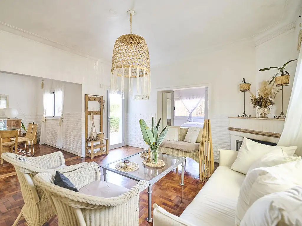 -Living con pisos de madera, pared de ladrillo a la vista, chimenea y mucha luz natural.