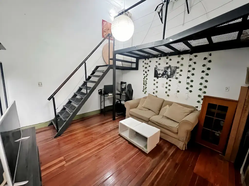 Living-comedor con techos altos y entrepiso metálico ideal como escritorio o espacio extra.
