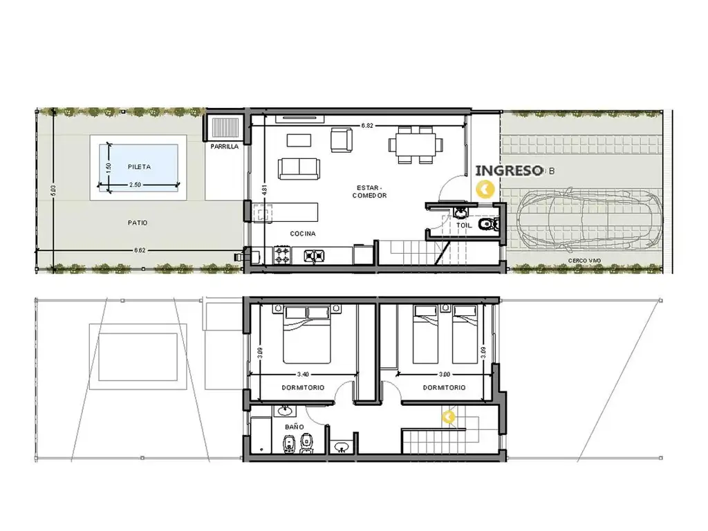 Moderna casa 2 dormitorios. La unidad se desarrolla en dos plantas: en la planta baja se ubica el ingreso vehicular, estar-comedor con cocina integrada, toilette y salida a un patio privado con parrillero y piscina. En planta alta, se encuentran los dormitorios, con baño completo y amplios ventanales que aportan luminosidad y ventilación natural. Espacioso espacio verde y cerco vivo que garantiza privacidad y una integración armónica con el entorno.