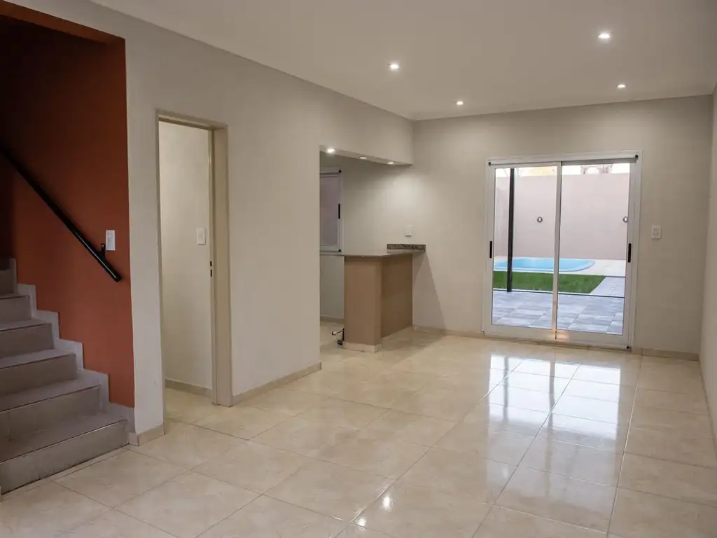 En planta baja contamos con un living comedor muy espacioso con una barra integrando la cocina , la cual es muy funcional.Salimos por una puerta balcón corrediza y nos encontramos con una galería de perfectas dimensiones con una parrilla para deleitar a varios comensales. A metros de ella , una hermosa pileta de fibra de vidrio con un buen tamaño ,ideal para acompañar los días de verano de intensas temperaturas .Un toilette culmina con los ambientes de esta planta.