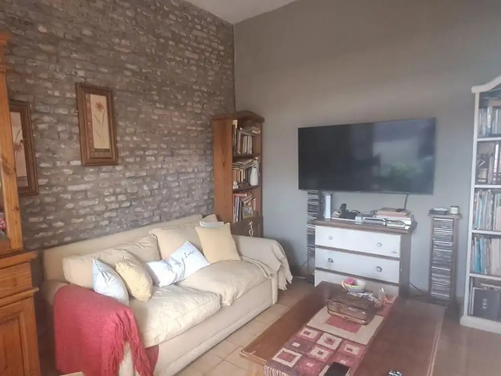 Living con detalles en madera y ladrillos a la vista, con salida a otro balcón.