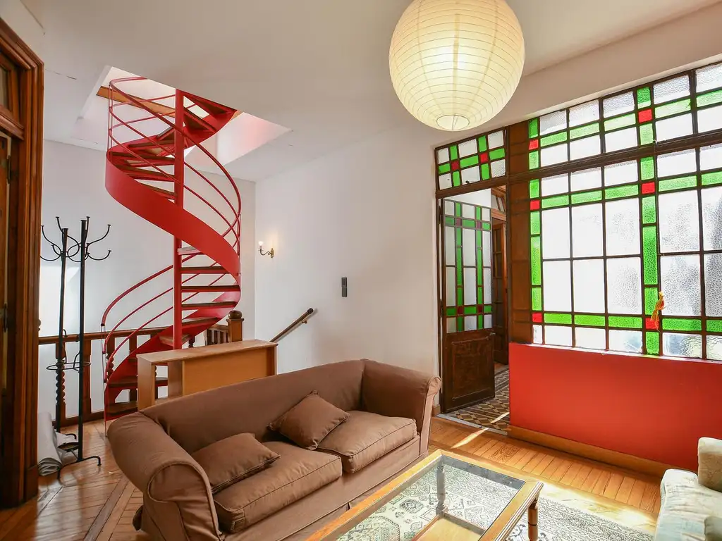 Se accede a la propiedad por escalera que desemboca en el hall principal. éste cuenta con iluminación natural que ingresa a través de un vitró que da al pulmón del PH. Hacia el frente, dos ambientes con piso de parqué y ventana a la calle, separados entre sí por una puerta corrediza de madera, pueden ser utilizados como living, comedor, estudio o dormitorio. El hall conecta a su vez con un pasillo que distribuye a dos amplios dormitorios, un baño completo, comedor y cocina. Existe doble acceso a la planta alta: uno principal, subiendo por escalera caracol desde el hall principal y otro de servicio, subiendo por escalera a la derecha de la cocina. En entrepiso, por la entrada de servicio, encontramos un lavadero completo.