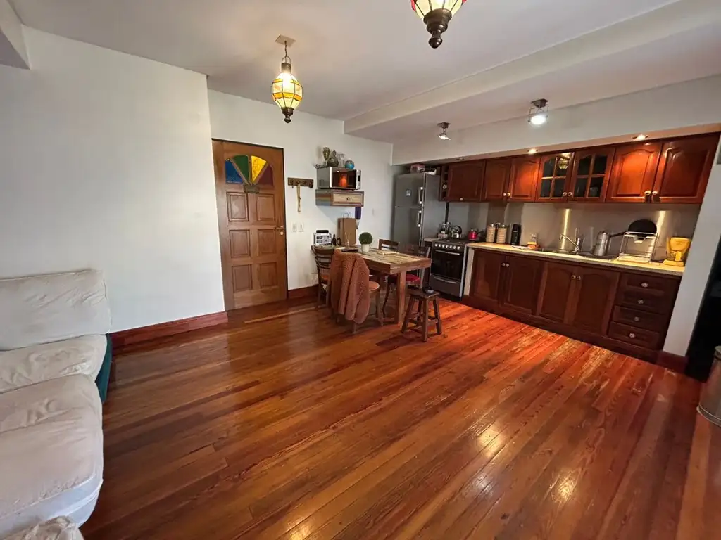 PH primer piso por escalera al frente tipo duplex en esquina. Ingreso a living comedor de 4 x 6 con piso de madera entarugado, cocina integrada al living con mueble sobre y bajo mesada y toilette. Salida a balcón de 2,5 x 1.
