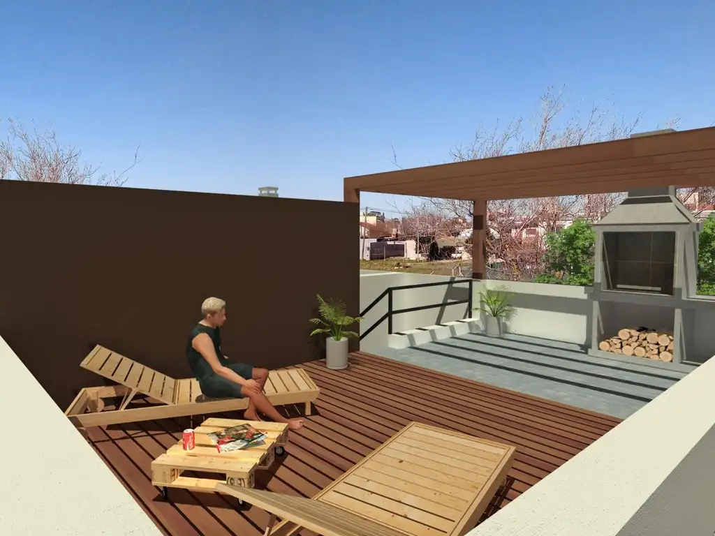 El exterior ofrece pisos de hormigón armado estampado, perfectos para el tránsito y la durabilidad, y una terraza impermeabilizada con membrana asfáltica MEGAFLEX que amplía las posibilidades de uso y disfrute del espacio.