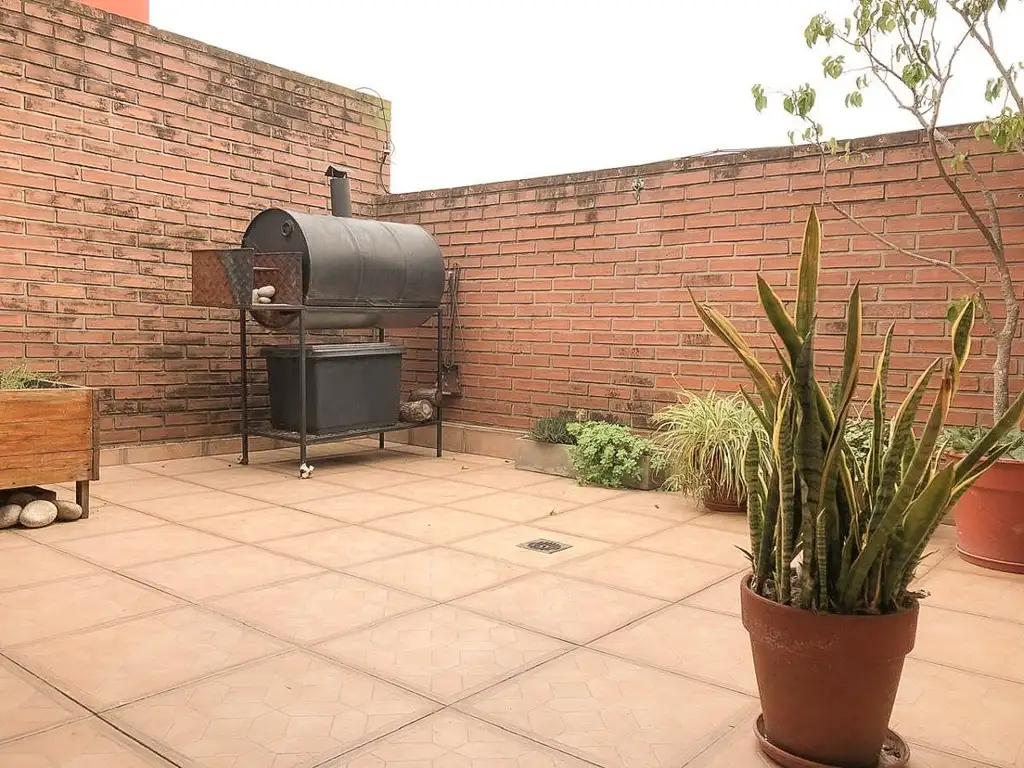 En un tercer piso con dos patios, se ingresa por uno de ellos, luego living comedor con cocina integrada + barra desayunadora. Por el pasillo se accede al baño, dormitorio, con puerta balcón que comunica al otro patio.