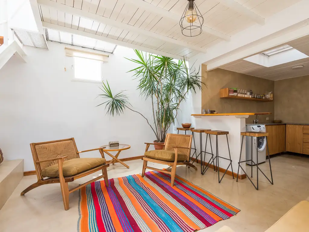 Excelente PH en duplex, muy luminoso y muy bien reciclado. Living 4 x4, cocina americana completa e integrada 3 x2, baño completo, dormitorio 4 X 4 con placares con salida a la terraza de 1,4 x 4 m descubierta. Son 42 m2 cubiertos + 6 m2 descubiertos = 48 m2 totales, Según escritura. Termotanque y cocina con horno eléctricos. Posee Aire Acondicionado.