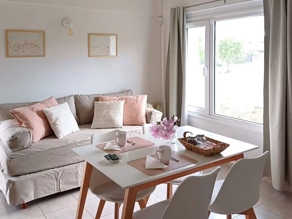 Cocina integrada con bajo mesada y alacenas, dormitorio luminoso, baño completo y cochera descubierta.