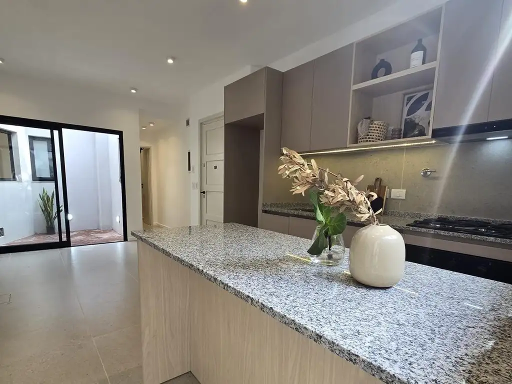 PB: Gran living comedor y cocina integrada con isla, muebles de cocina de diseño, anafe y horno instalados, griferías Peirano, pisos y revestimientos de San Lorenzo de primera calidad, aberturas de aluminio Módena. Dos dormitorios, el principal con baño con antebaño en suite y vestidor, placard con interiores empotrado en segundo dormitorio, 2 baños completos en total, 2 patios, lavadero independiente.