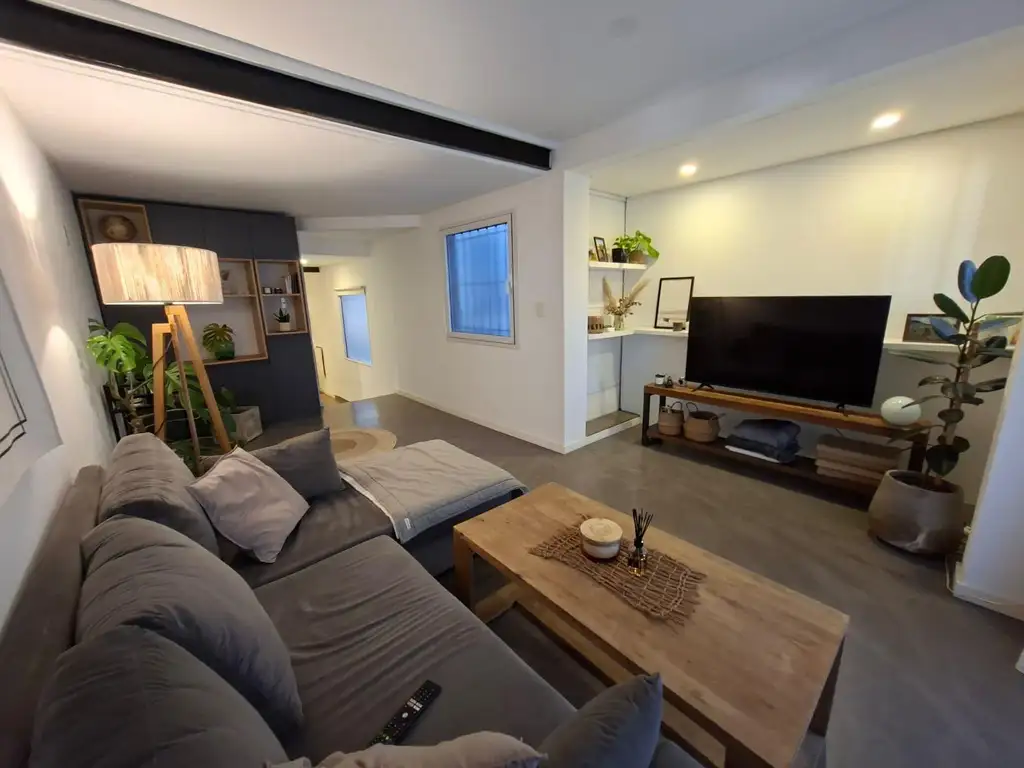 Al ingresar, un recibidor/comedor se abre a una vista profunda y continua que guía la mirada hacia el jardín del fondo. En este ambiente, la cocina integrada se presenta con materiales nobles y un mismo piso que unifica todo el espacio, creando una sensación de amplitud y cohesión. A un costado, una elegante escalera conduce a la planta superior. Antes de pasar al área social, se encuentra un baño completo. El recorrido continúa hacia un living de 3,30m de ancho, un espacio ideal para el descanso, que se conecta directamente con un espectacular jardín de 20 m2 que marca la diferencia.