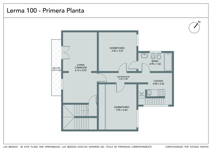 Ambientes principales: living comedor, con balcón, dos dormitorios, un baño completo.