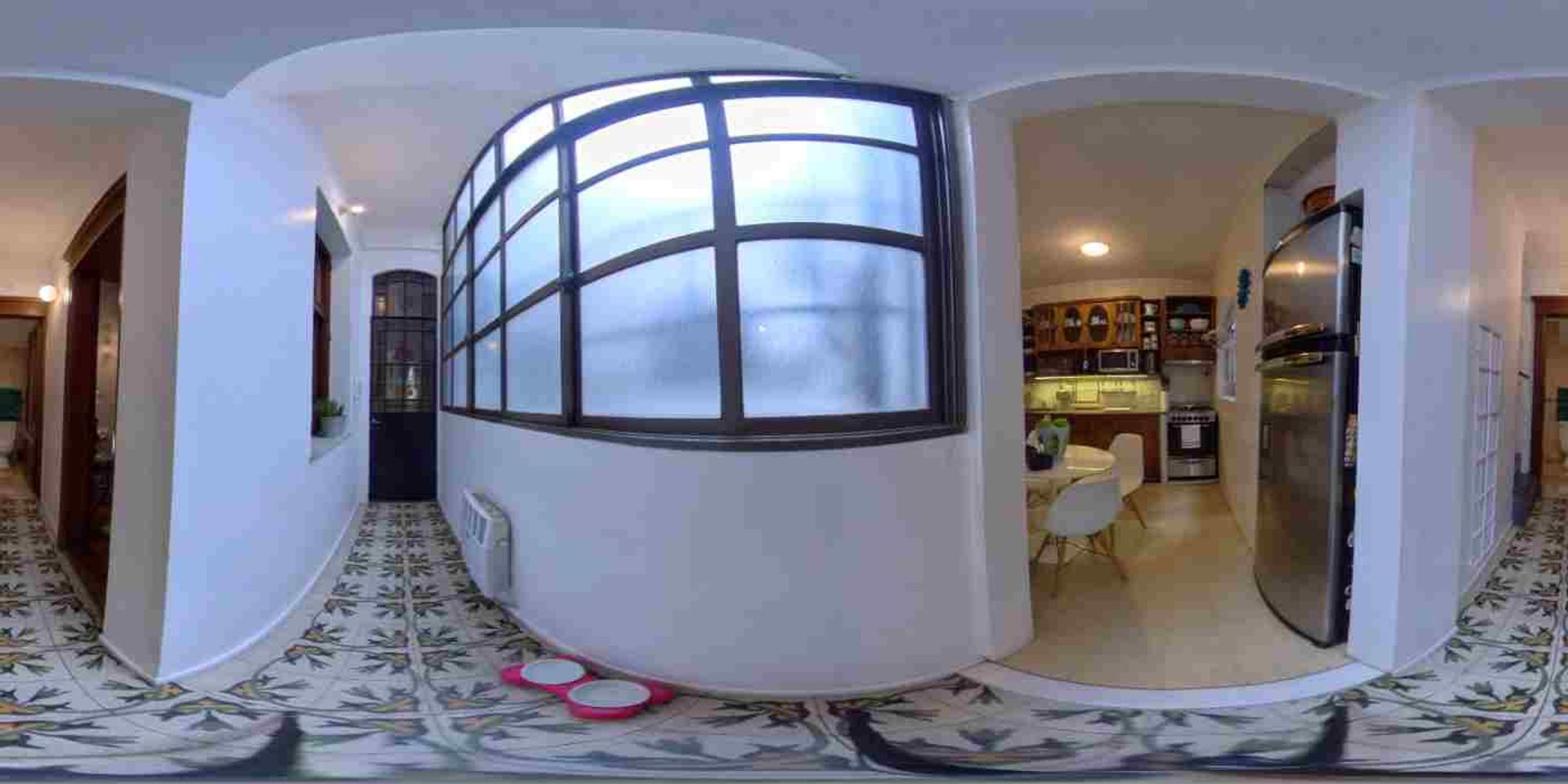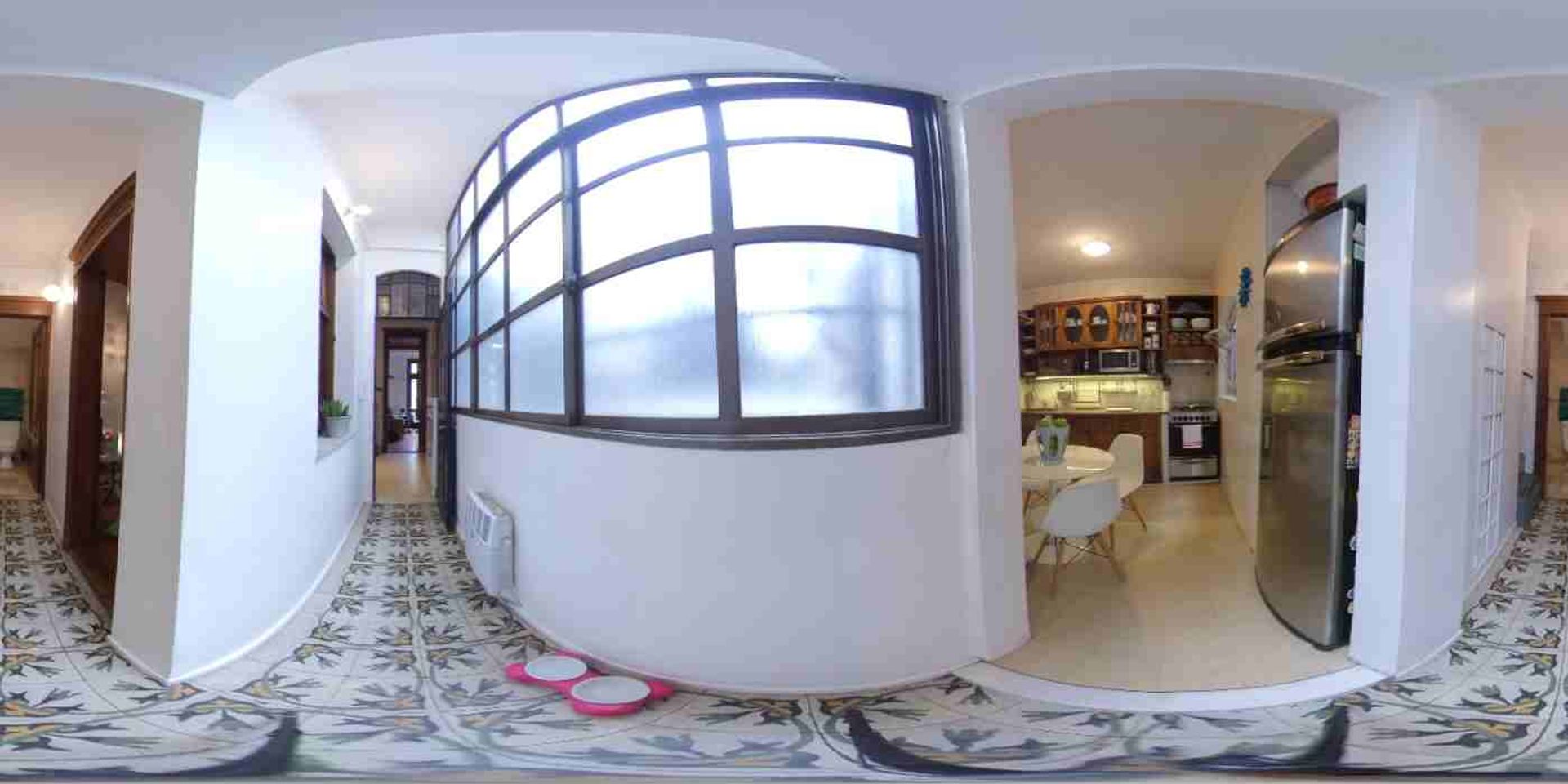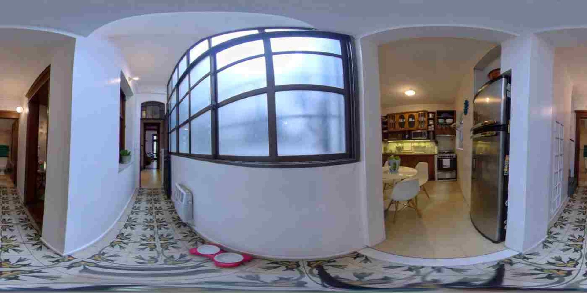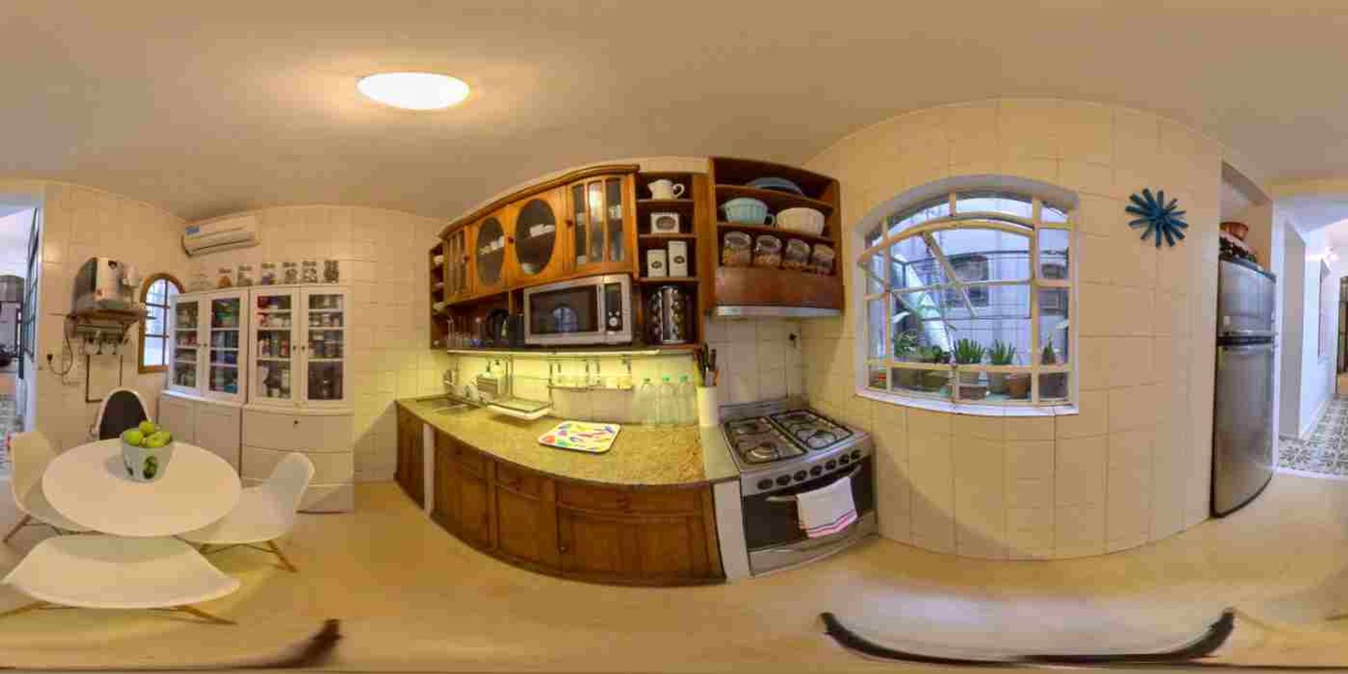Por la puerta de vitreaux antigua pasamos al pasillo con ventanal y pisos originales calcáreos e instalación de tiro balanceado, llegando hacia la cocina con comedor diario, con dos ventanas a los patios internos de la casa, con mueble antiguo aparador de roble de Eslavonia bajo y sobre mesada. Spar eléctrico de muy buen diseñado integrado respetando las líneas originales del mueble y luces led bajo el mueble sobre mesada. Instalación de AA.