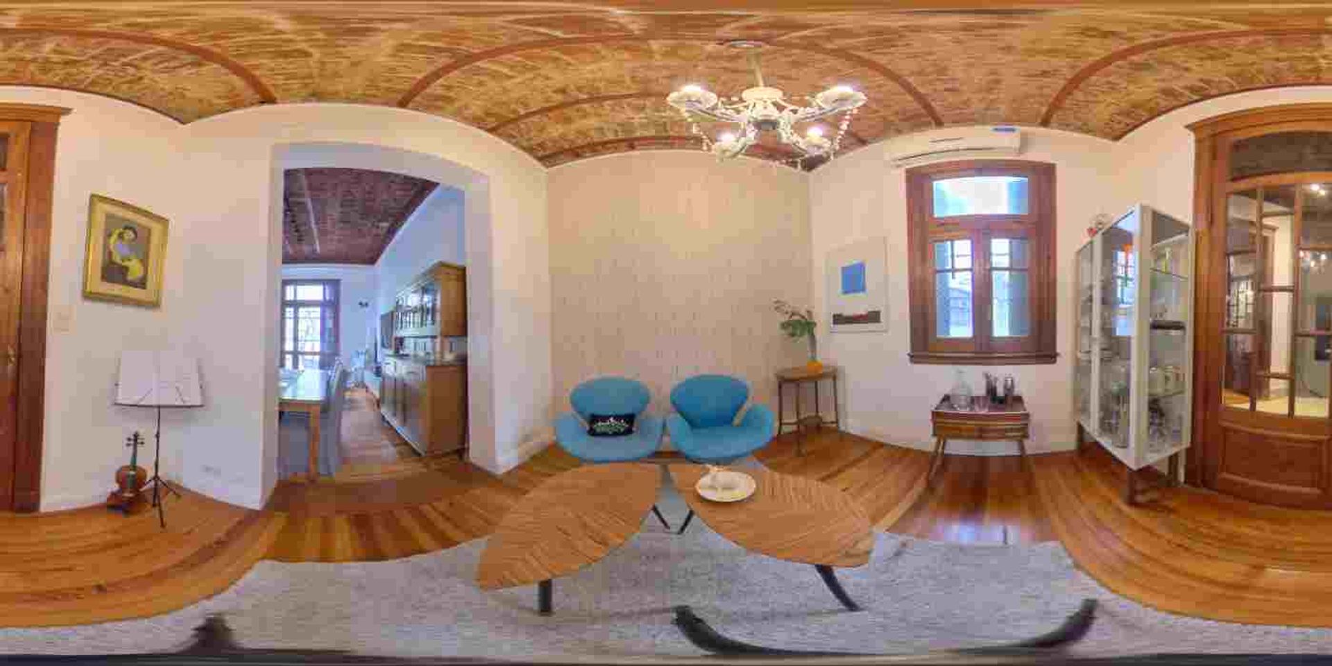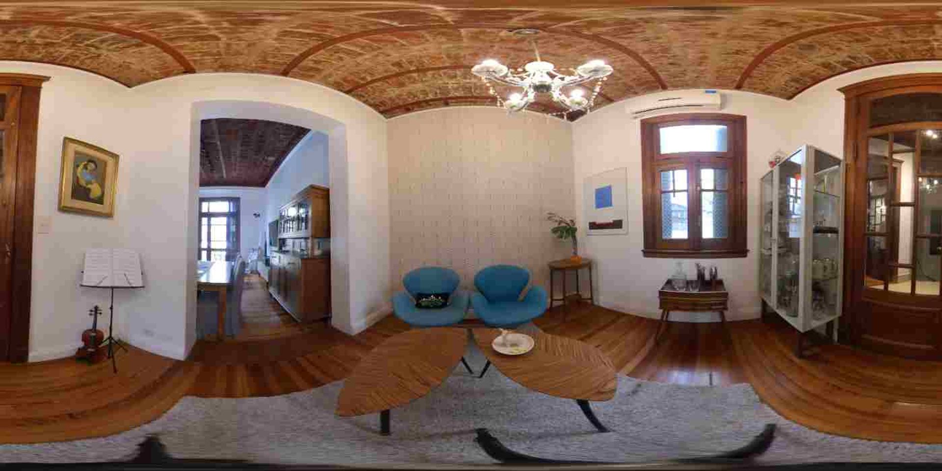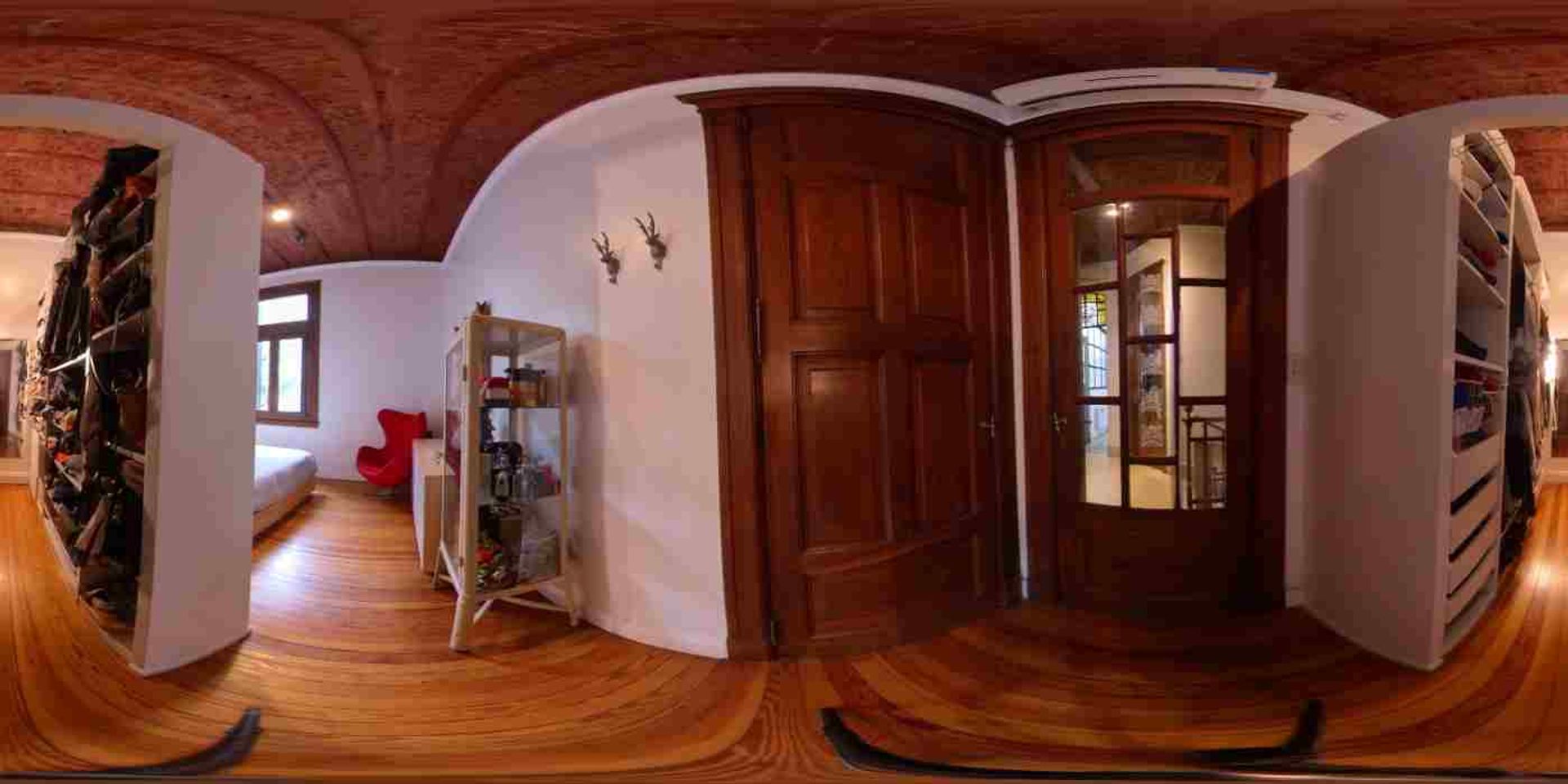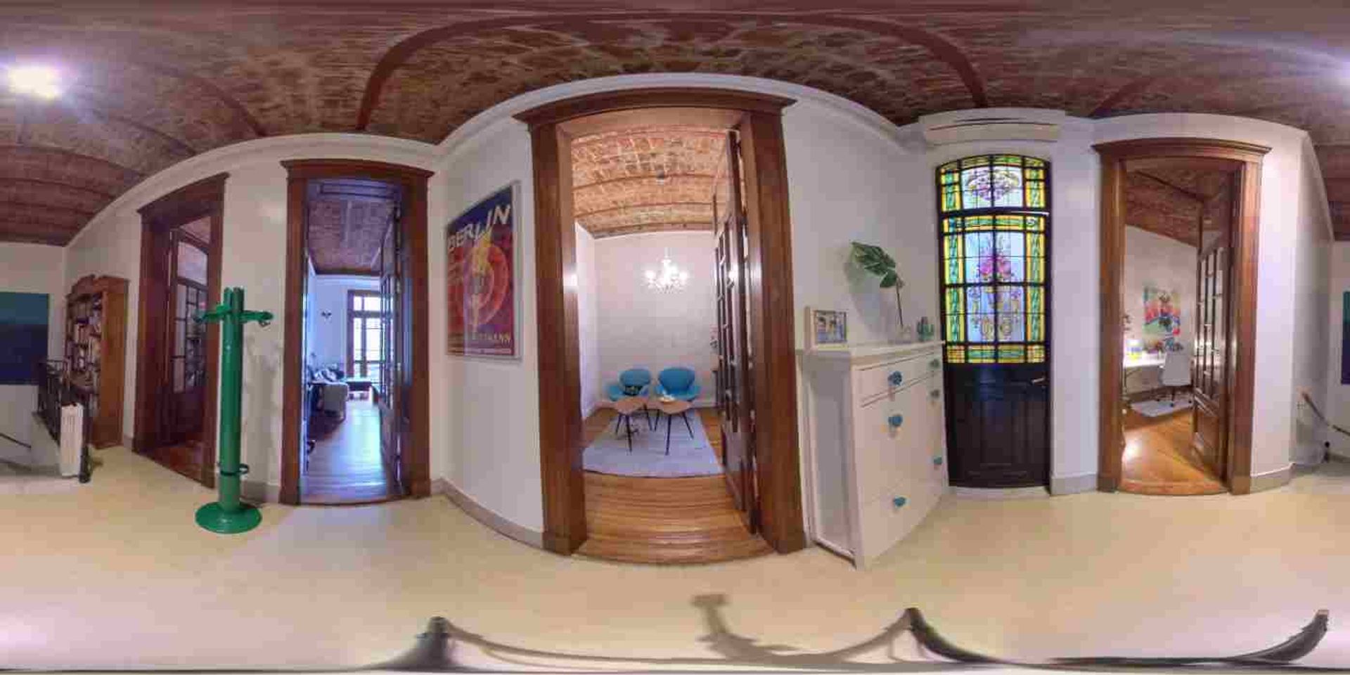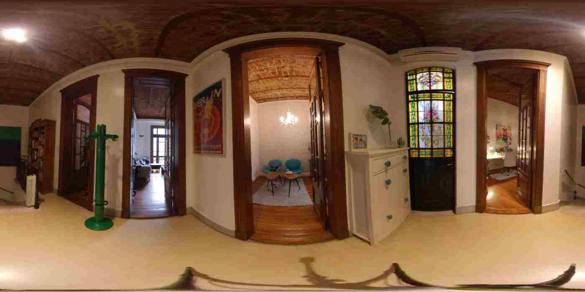 Hall de recepción distribuidor hacia los principales ambientes de la casa con instalación de AA, baranda de hierro forjado y detalles de madera torneada.
