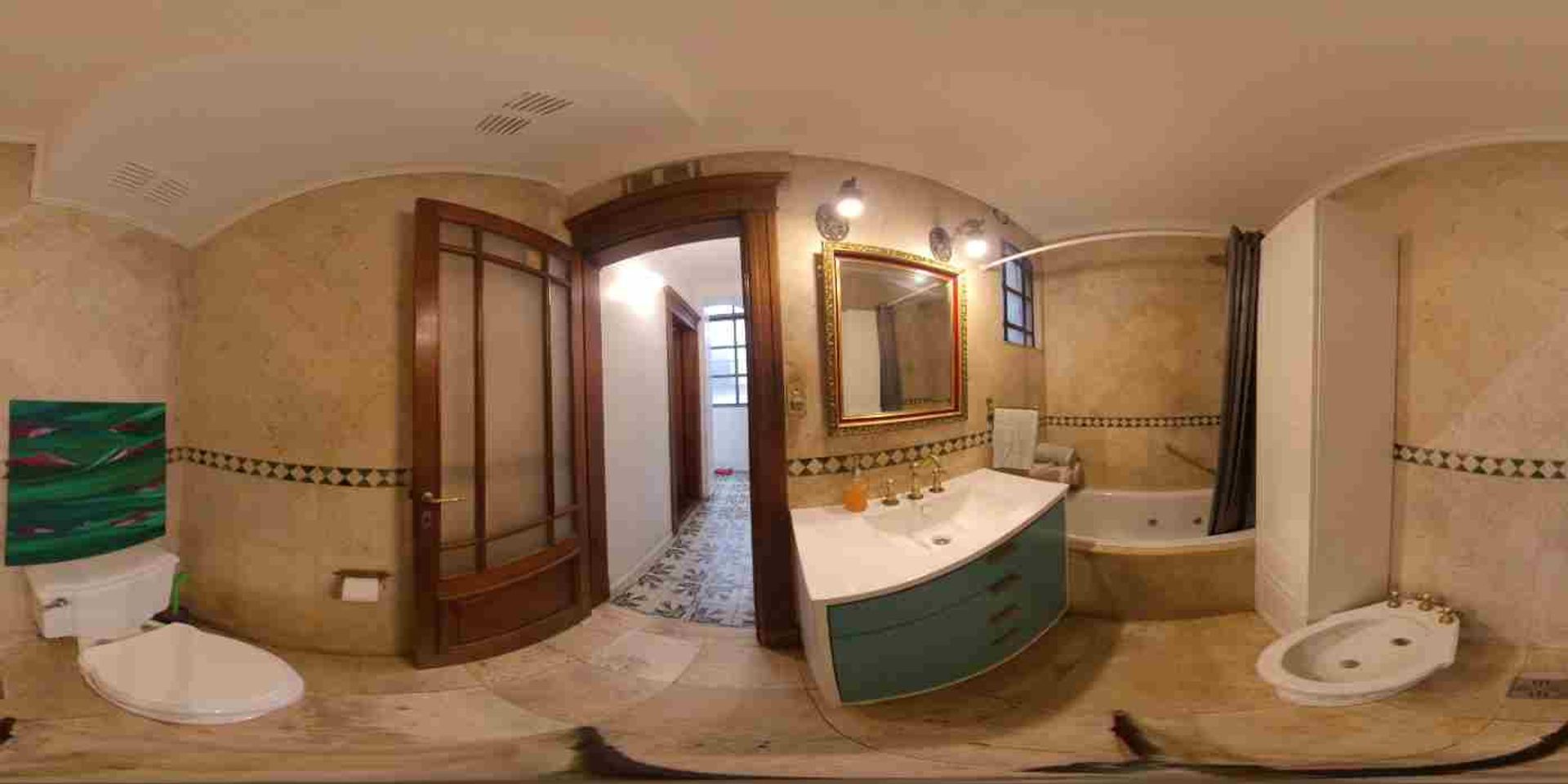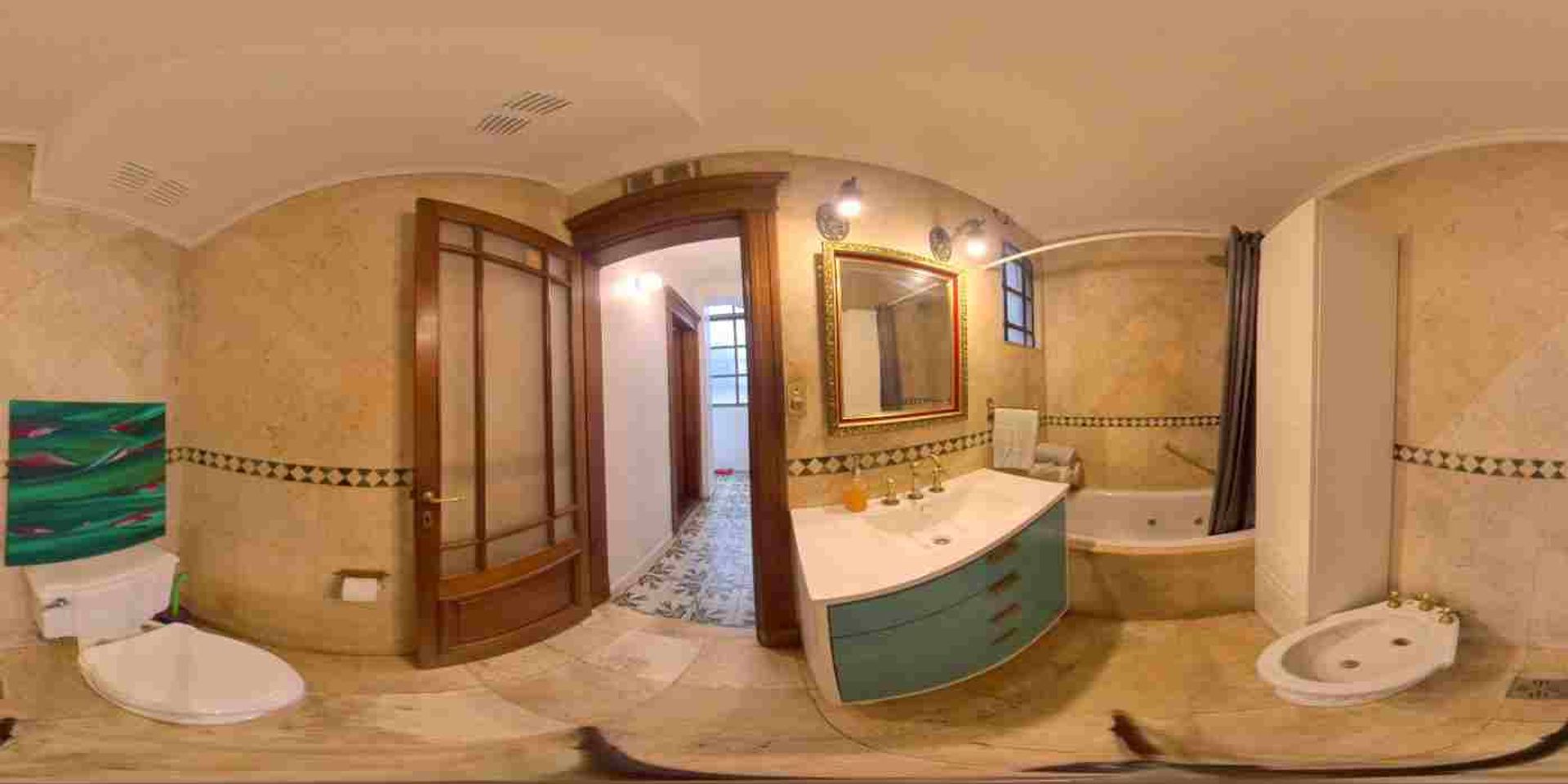 Baño Completo con bañera, con piso y paredes de mármol con ventana al patio interno y sistema de aireación eléctrico con accesorios de bronce.