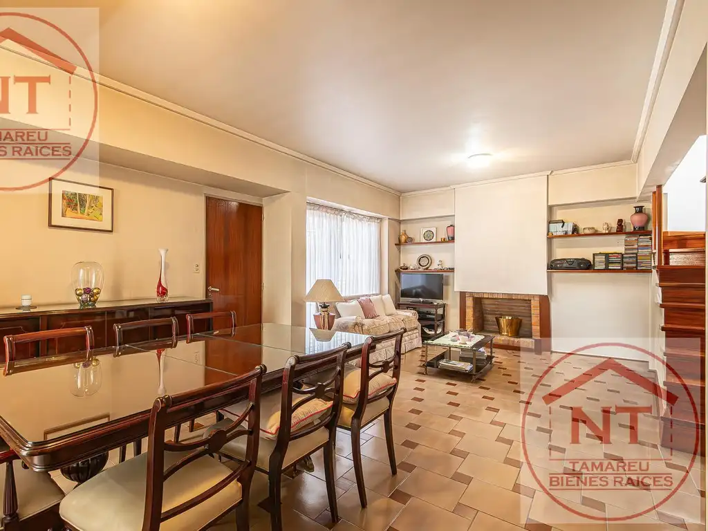 Del otro lado del hall, encontramos una puerta con acceso al living comedor, amplio, luminoso, con doble circulación, escalera con baranda de madera lustrada, con llegada a la planta alta y doble ventanales con persianas barrio, uno de ellos da al frente y el otro con salida al patio principal adornado con árboles y plantas. .