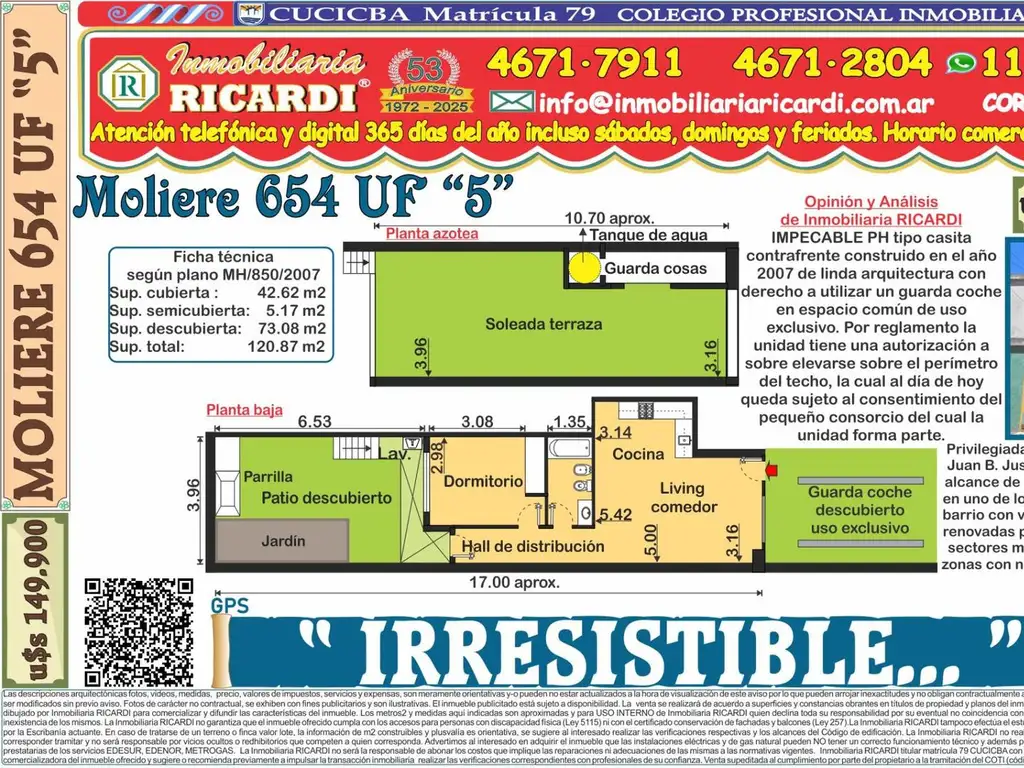 Son 42.62 m2 cubiertos y 120.87 m2 totales y propios para este PH que no necesita hacer nada de nada y esta para mudarse en forma inmediata.