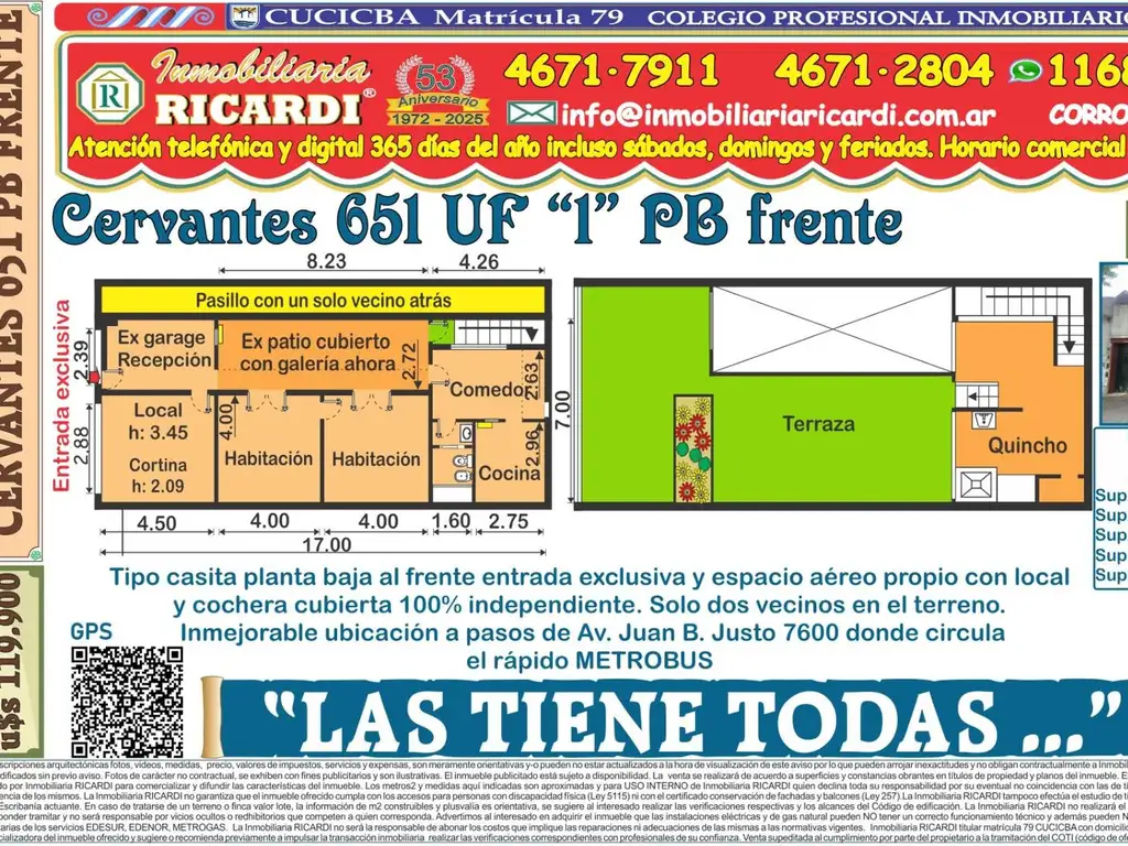 La Inmobiliaria RICARDI NO garantiza que el inmueble cumpla con el certificado de conservación de fachadas y balcones (Ley 257) tampoco efectúa el estudio de títulos, ni analiza los alcances del Código de edificación y no será responsable por los vicios ocultos o redhibitorios que competen a quien corresponda. Advertimos al adquirente que las instalaciones eléctricas, de gas natural y-o sanitarias pueden NO solo no tener un correcto y adecuado funcionamiento técnico sino que además puede NO cumplir con las exigencias actuales de METROGAS- EDESUR- EDENOR - siendo a cargo del adquirente que implique su puesta en valor y-o funcionamiento.