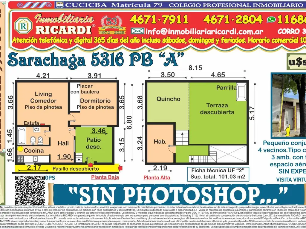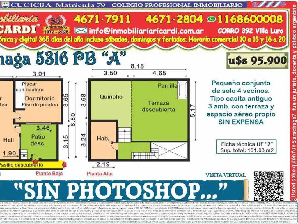 La Inmobiliaria RICARDI NO garantiza que el inmueble cumpla con el certificado de conservación de fachadas y balcones (Ley 257) tampoco efectúa el estudio de títulos, ni analiza los alcances del Código de edificación y no será responsable por los vicios ocultos o redhibitorios que competen a quien corresponda. Advertimos al adquirente que las instalaciones eléctricas, de gas natural y-o sanitarias pueden NO solo no tener un correcto y adecuado funcionamiento técnico sino que además puede NO cumplir con las exigencias actuales de METROGAS- EDESUR- EDENOR - siendo a cargo del adquirente que implique su puesta en valor y-o funcionamiento.