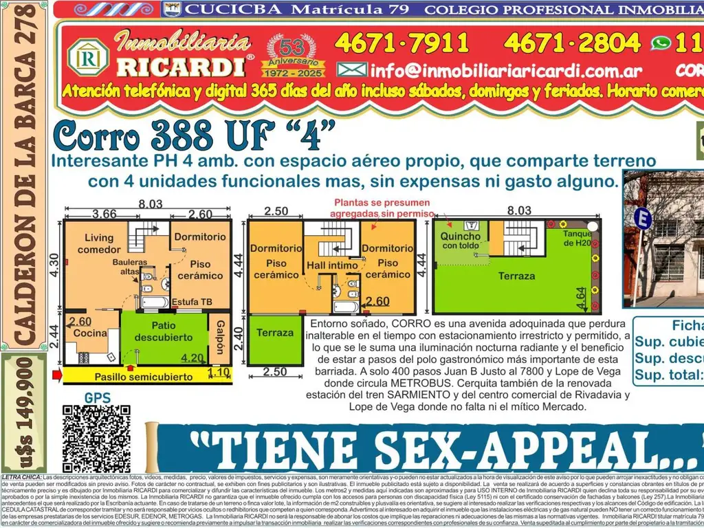 La Inmobiliaria RICARDI NO garantiza que el inmueble cumpla con el certificado de conservación de fachadas y balcones (Ley 257) tampoco efectúa el estudio de títulos, ni analiza los alcances del Código de edificación y no será responsable por los vicios ocultos o redhibitorios que competen a quien corresponda. Advertimos al adquirente que las instalaciones eléctricas, de gas natural y-o sanitarias pueden NO solo no tener un correcto y adecuado funcionamiento técnico sino que además puede NO cumplir con las exigencias actuales de METROGAS- EDESUR- EDENOR - siendo a cargo del adquirente que implique su puesta en valor y-o funcionamiento.