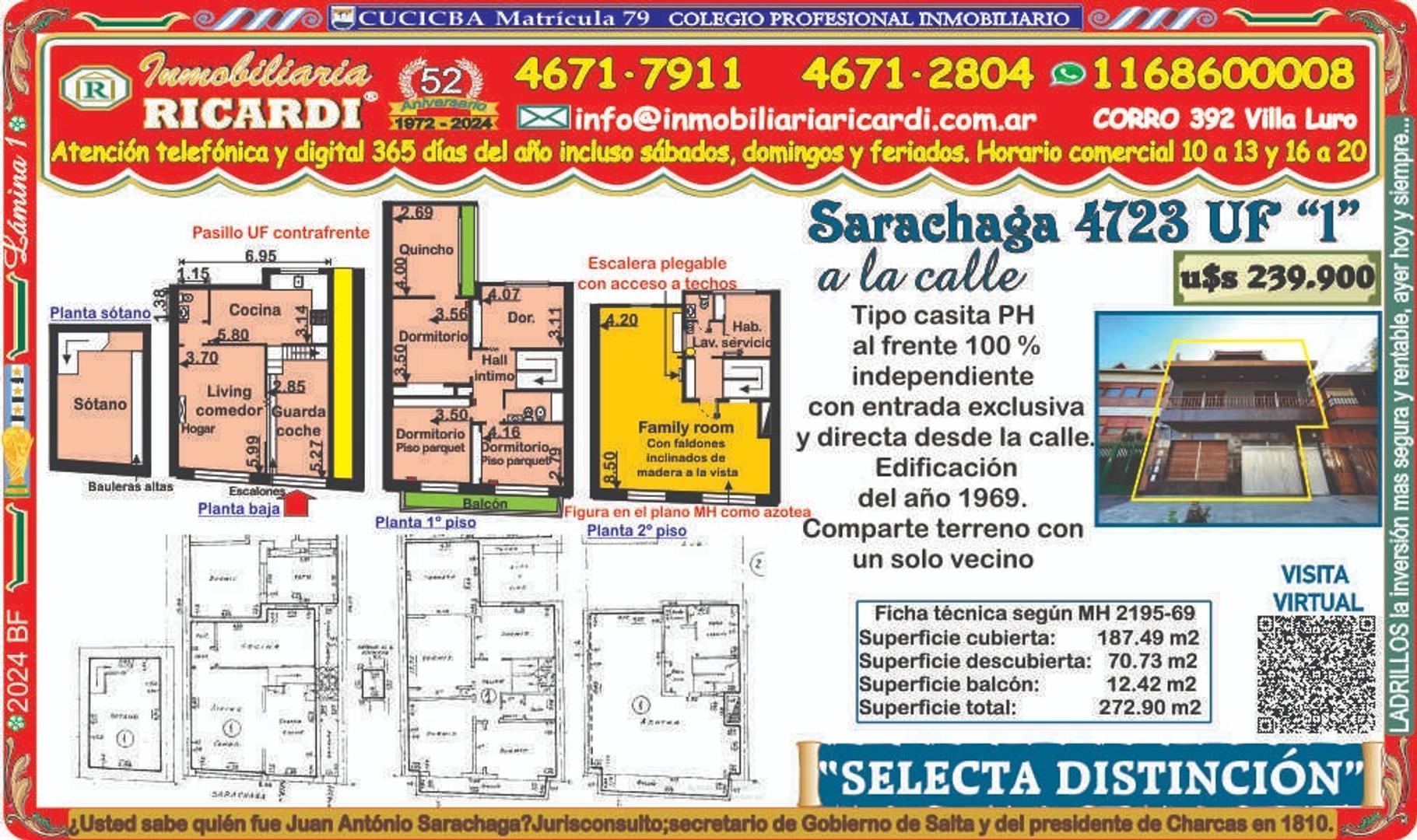 El inmueble publicitado se encuentra está sujeto a disponibilidad y la Inmobiliaria RICARDI actúa como comercializador del inmueble., siendo bajo responsabilidad del propietario la tramitación del COTI.