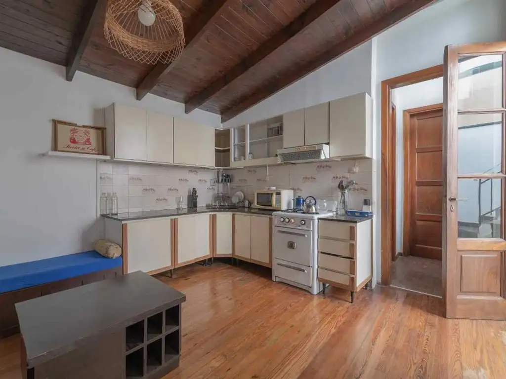 La cocina es muy amplia, tiene alacenas y muebles bajo mesada. Muy buen lugar de trabajo, ya que la mesada es muy cómodo...los pisos....atípicos, son de pino tea, y están en excelente estado. Los dejarías así o los cambiarías?.