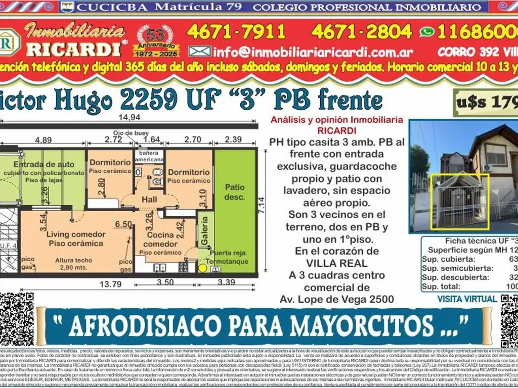 La Inmobiliaria RICARDI NO garantiza que el inmueble cumpla con el certificado de conservación de fachadas y balcones (Ley 257) tampoco efectúa el estudio de títulos, ni analiza los alcances del Código de edificación y no será responsable por los vicios ocultos o redhibitorios que competen a quien corresponda. Advertimos al adquirente que las instalaciones eléctricas, de gas natural y-o sanitarias pueden NO solo no tener un correcto y adecuado funcionamiento técnico sino que además puede NO cumplir con las exigencias actuales de METROGAS- EDESUR- EDENOR - siendo a cargo del adquirente que implique su puesta en valor y-o funcionamiento.