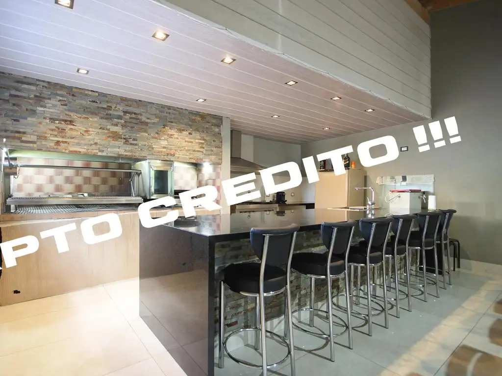 La planta alta te sorprenderá con un quincho de lujo totalmente equipado para recibir a 30 personas cómodas, ideal para los entendidos del buen vivir o los amantes de la cocina, en este espacio NO se escatimó en detalles ni en gastos, parrilla de acero inoxidable con la mejor calidad, espacio para colocar disco de arado o paellera, cocina industrial de acero inox. de 4 hornallas mas plancheta y horno, campana extractora marca "Maraldi" también de acero, dos heladeras bajomesada hechas a medida, bacha de acero Johnson modelo Luxor con triturador para alimentos y monocomando alemán extensible, una barra enorme de granito negro, dos aires acondicionados inverter recién instalados marca BGH Silent Air de 5100 fg, cerramientos de aluminio linea Módena con doble vidrio hermético (DVH), pisos de porcelanato. También en la planta alta tenés el segundo baño completo con pisos y paredes de porcelanato, sanitarios "Ferrum" con grifería con cierre cerámico, espejo inteligente y box de ducha con mampara esmerilada Blindex. Por último el patio con horno de barro y techo corredizo de aluminio.