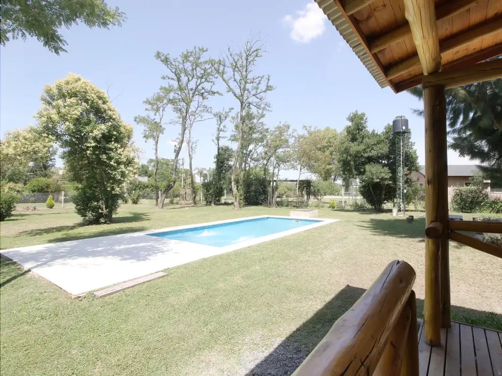 Disfruta de la tranquilidad y la naturaleza en este predio rodeado de árboles y espacios verdes. La pileta es perfecta para refrescarse en los días calurosos de verano, mientras que la cabaña de troncos ofrece un acogedor refugio para relajarse y disfrutar del entorno.
