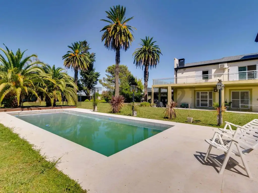 7 entre 615 y 616, casa en esquina sobre lote de aproximadamente 2200m2, totalmente perimetrada con muros y porton automatizado, ingreso tanto por avenida 7 como por calle 616. Consta de jardin parquizado con arboles añejos, pileta, garage semicubierto para 3 autos, y entrada de autos para varios autos. La casa se desarrolla en dos plantas, en planta baja posee living, cocina comedor con muebles bajo y sobre mesada, dormitorio con vista al patio, baño con ducha, dormitorio principal en suite, quincho con parrilla, mesada y baño completo. En planta alta posee dos habitaciones, playroom, baño completo y balcon terraza con vista a todo el parque. La casa posee amplios ventanales con vista al jardin y galeria semicubierta en el perimetro, ademas cuenta con sistema de riego automatico. Ideal vivienda permanente, quinta de fin de semana, propiedad apta instituciones, ubicada sobre avenida y de rapido acceso a los principales puntos de la ciudad.