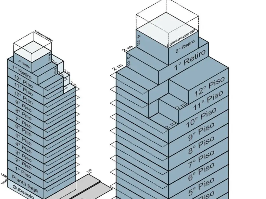 L.O. y la L.I.B. se puede edificar un basamento hasta los seis metros (6m) de altura desde la cota de la