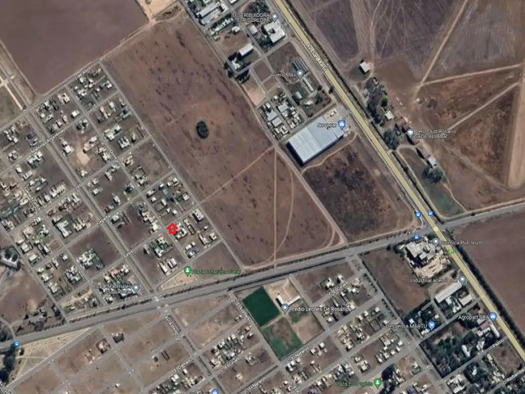 Lote en Estación Alvear I, a 100 m de plaza del barrio y de avenida principal. Se encuentra en la esquina de Dorrego y Junín, de 9,50 m x 31.65 m. Todos los servicios