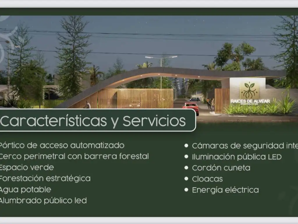 Descripción: Raíces de Alvear es un barrio residencial cerrado diseñado para quienes buscan seguridad, tranquilidad y contacto con la naturaleza. Su forestación estratégica y su ubicación privilegiada lo convierten en una opción ideal para quienes desean vivir en un entorno armonioso sin alejarse de la ciudad. El Proyecto cuenta con 242 lotes residenciales desde 250 m2 a 335 m2.