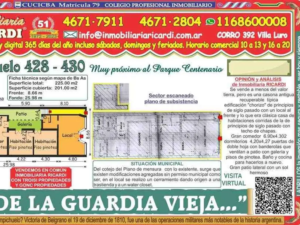 La Inmobiliaria RICARDI NO garantiza que el inmueble cumpla con el certificado de conservación de fachadas y balcones (Ley 257) tampoco efectúa el estudio de títulos, ni analiza los alcances del Código de edificación y no será responsable por los vicios ocultos o redhibitorios que competen a quien corresponda. Advertimos al adquirente que las instalaciones eléctricas, de gas natural y-o sanitarias pueden NO solo no tener un correcto y adecuado funcionamiento técnico sino que además puede NO cumplir con las exigencias actuales de METROGAS- EDESUR- EDENOR - siendo a cargo del adquirente que implique su puesta en valor y-o funcionamiento.