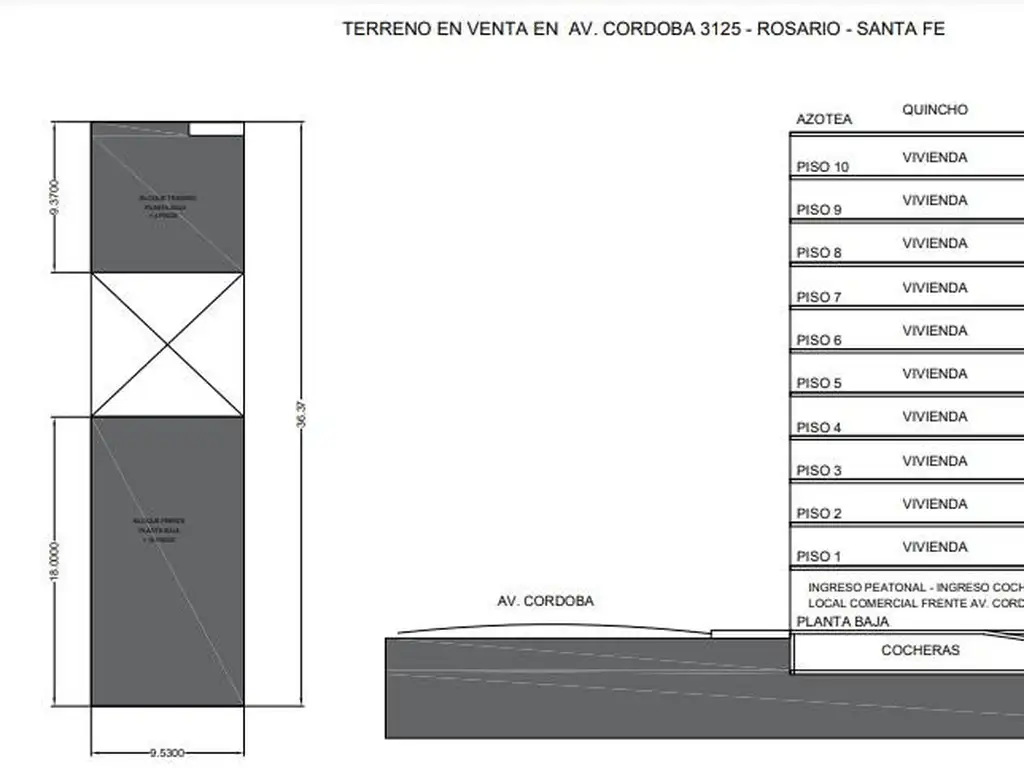 Se trata de un terreno de 9.53 metros de frente por 36.37 metros de fondo.