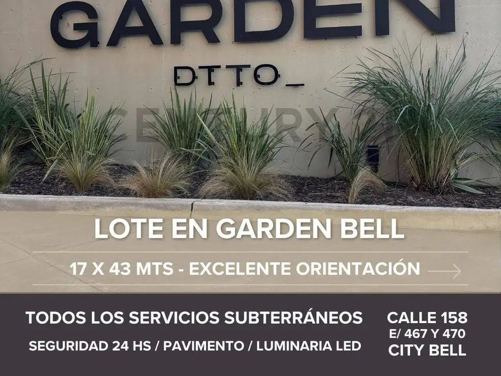 Hermoso lote interno de 726 m2 en barrio privado Garden Bell. Con la mejor orientación (noreste).Garden Bell se encuentra a 20 minutos del centro de La Plata. Un barrio con 65 lotes, resultado de un cuidadoso diseño urbanístico pensado y concebido para brindar calidad de vida buscando lograr bajos costos de mantenimiento. Garden cuenta con todos los servicios subterráneos: luz eléctrica, agua potable y red cloacal con planta de tratamiento cloacales/ biodigestores individuales.Todas las calles pavimentadas y con luminarias led. Sector de residuos por UF.Seguridad 24 HS. Cerco perimetral monitoreado.