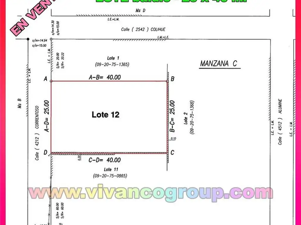 Se trata de un lote baldío de 25 m. de frente por 40 m. de fondo. Cuenta con todos los servicios, incluso asfalto y cloacas. Distante a 200 m. del E.C.E.N. (Escuela Cristiana Evangélica de Neuquén) y a 600 m. del Hipermercado Chango Más (ex Hiper WAL MART).