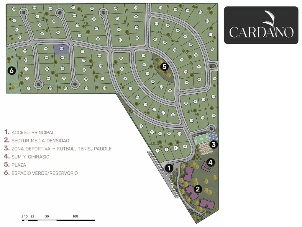 Cardano es un proyecto sobre 18,5 hectáreas con 104 lotes de 1.000 a 2.300 mts2, donde se busca que prevalezca, gracias a su diseño de calles curvas, la intimidad y privacidad sin perder el sentido de convivencia.