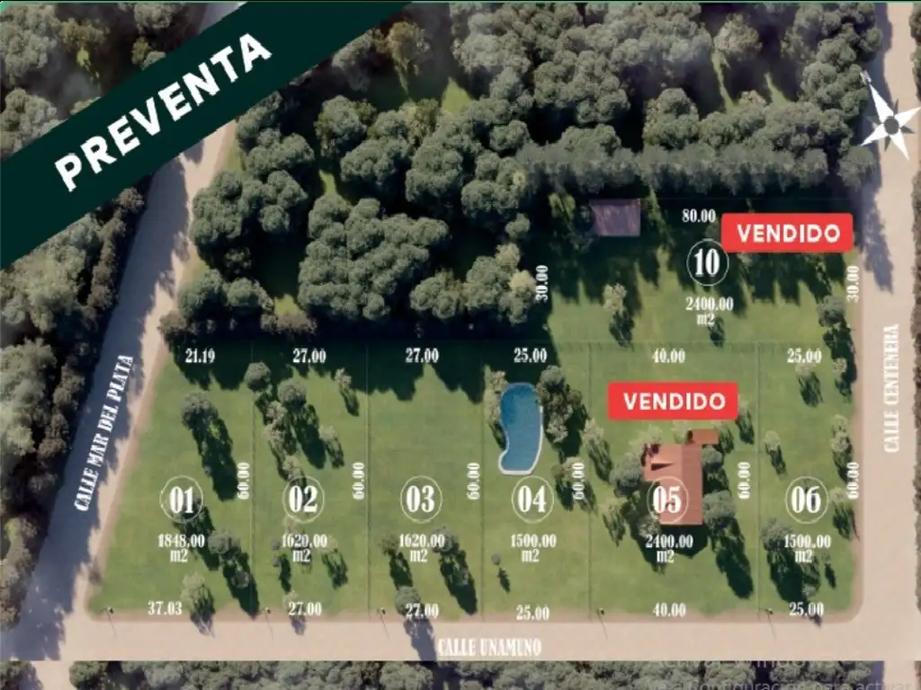 Lote 6 - Venta de lote baldío en esqiuina (Unamuno y Centenera) de 1500 m², de forma rectangular regular, con buena arboleda. Ubicado en zona de quintas y vivienda permanente a 150 m de la ex Ruta 8. En la zona hay luz, agua de pozo y agua corriente, pozo ciego y gas natural.