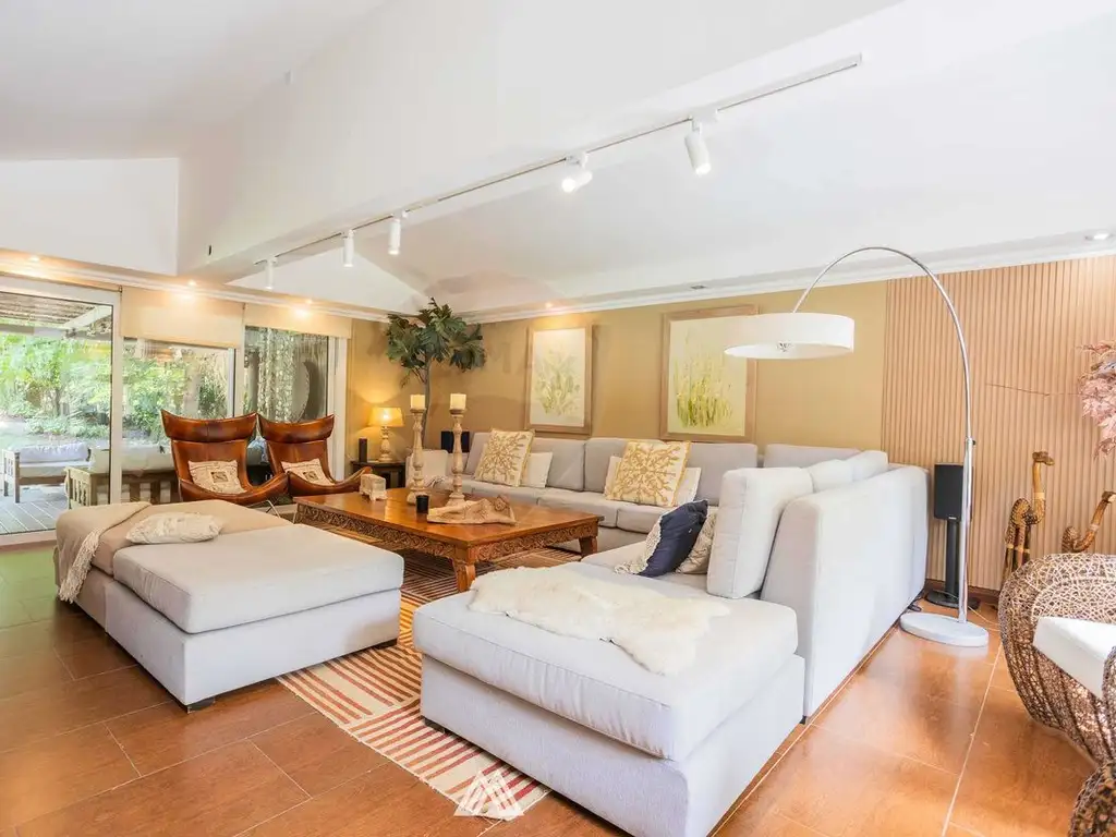 Se ingresa por puerta principal a recibidor con sala de estar comunicada a living comedor con estafua a leña con puerta ventana a hermoso jardin parquizado con 53m2 de pérgolas, fogón, piscina climatizada de 54 m2 y jacuzzi exterior.