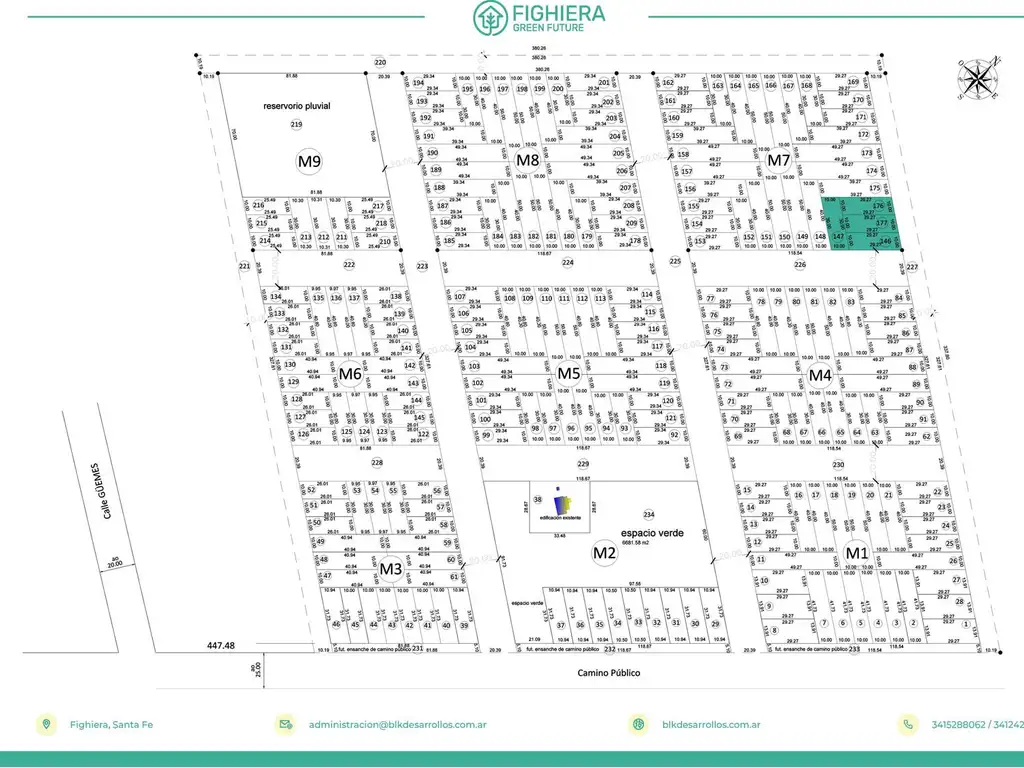 Son 220 lotes de entre 300 y 800 m2 distribuidos en 9 manzanas que sumados a los 8000m2 de espacios verdes destinados a esparcimiento, con una ubicación privilegiada cerca del área urbana de Fighiera y del río Paraná.