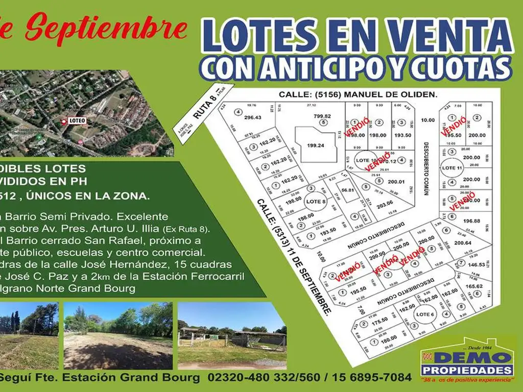 Loteo en Excelente ubicación , a 10 metros de Av. Pte. Arturo Illia ( Ruta 8) y Transporte publico, zona de Casas importantes y permanentes, frente a Barrio cerrado San Rafael, a una cuadra de Touring Club, a 5 cuadras de calle Jose Hernandez y zona Comercial, a 18 cuadras de Cruce Jose C. Paz, Av. del Sesquicentenario ( Ruta 197) y a 2 km de Estación de Ferrocarril Belgrano Norte de Grand Bourg.-