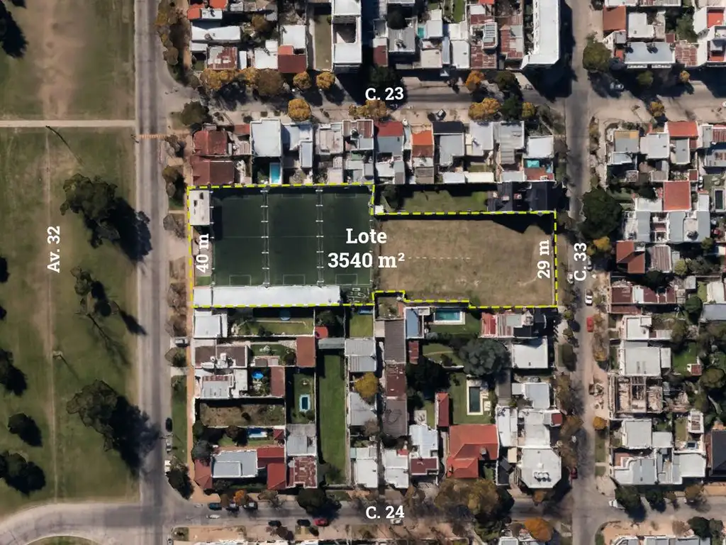 Cuenta con 40 mts de frente por Av 32 y 29 Mts de frente por calle 33.